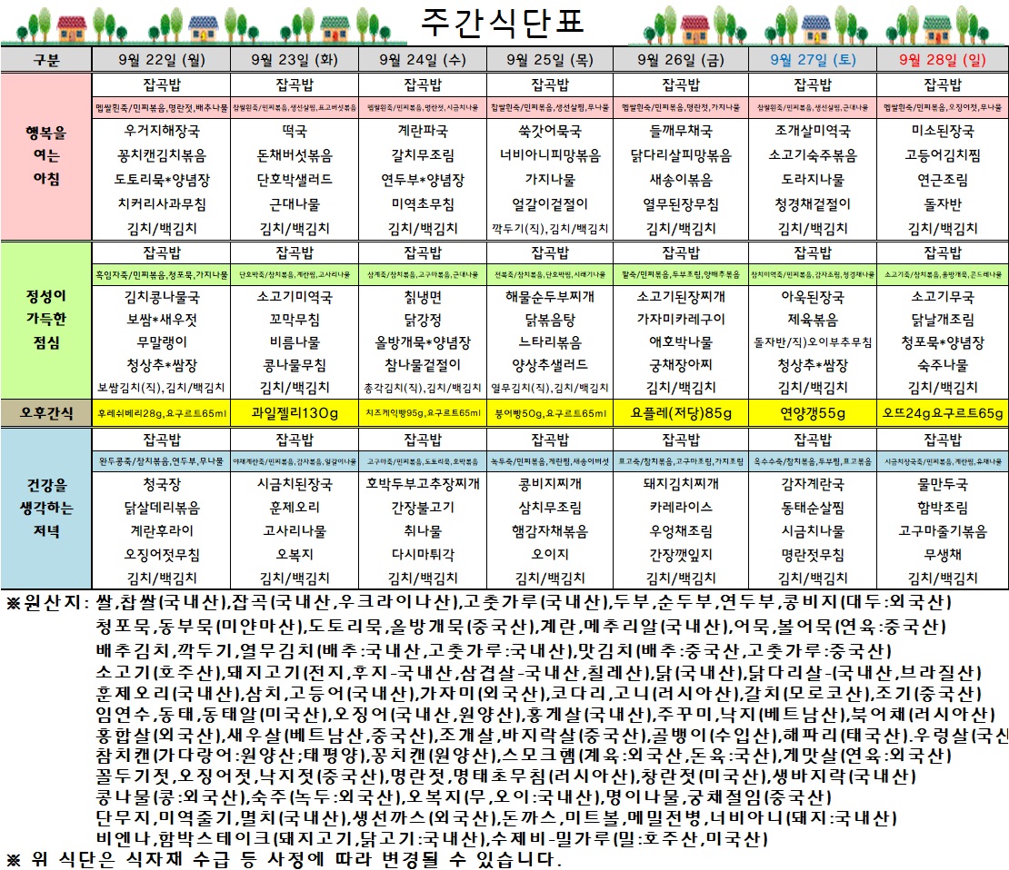 주간식단표(2025.09.22 ~ 2025.09.28)